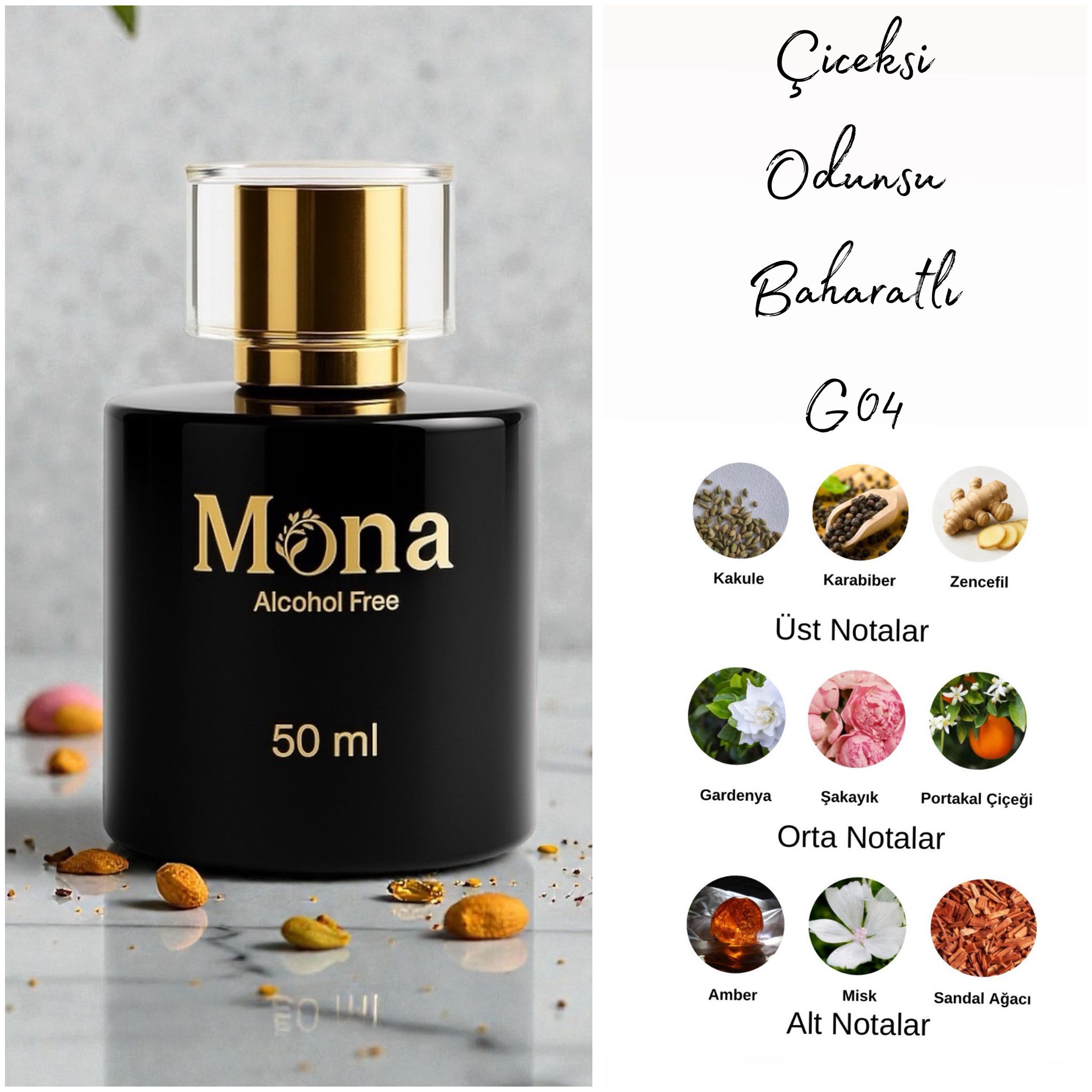MONA G04; zarafeti, tazeliği ve feminenliği bir araya getiren ikonik çiçeksi bir parfümdür. Açılışta bergamotun canlı ferahlığı ile armutun yumuşak meyvemsi dokusu buluşur. Orta notalarda yasemin, mimoza ve lotus çiçeği gibi zarif çiçekler kokuya sofistike ve kadınsı bir derinlik kazandırır.