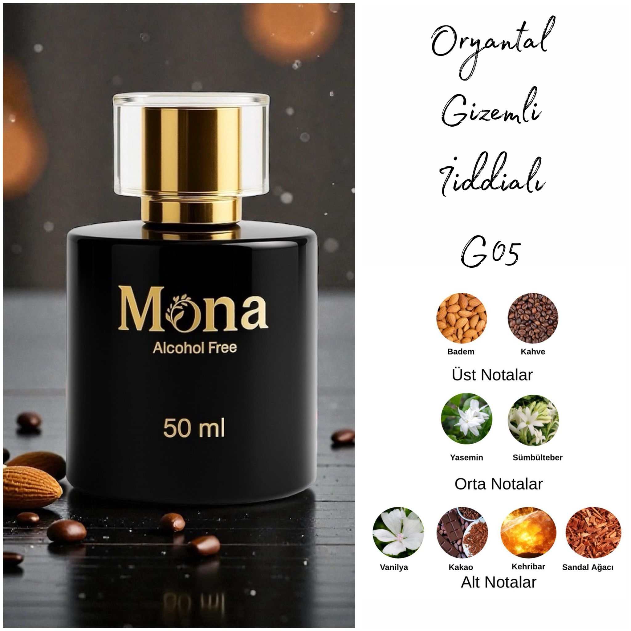 MONA G05; hem cesur hem de zarif kadınların imza kokusu olmaya aday, modern ve büyüleyici bir parfümdür. Açılışta bergamotun ferah ışığı ile bademin yumuşak tatlılığı buluşur. Orta notalarda yasemin sambac ve tütsülü tonka fasulyesi birleşerek çarpıcı, derin ve feminen bir karakter yaratır.