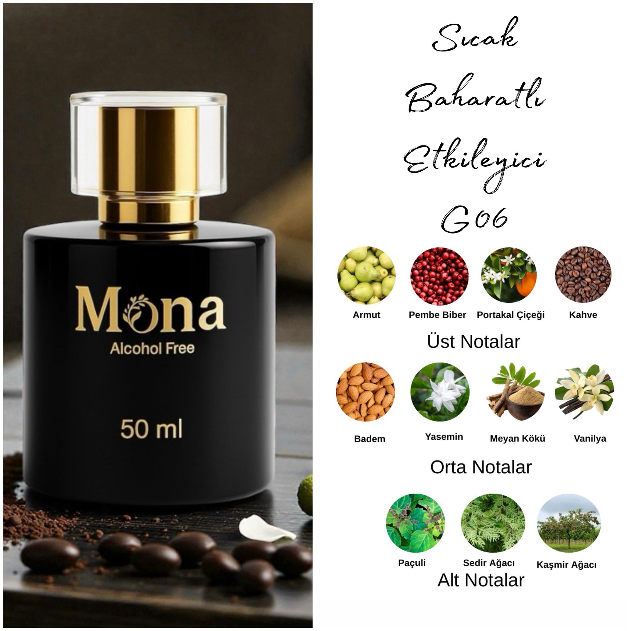 MONA G06; bağımlılık hissi uyandıran sıcak, tatlı ve modern bir parfümdür. Açılışta kahve notalarının enerjik ve yoğun aroması, vanilya tonlarıyla harmanlanarak güçlü bir ilk izlenim oluşturur.