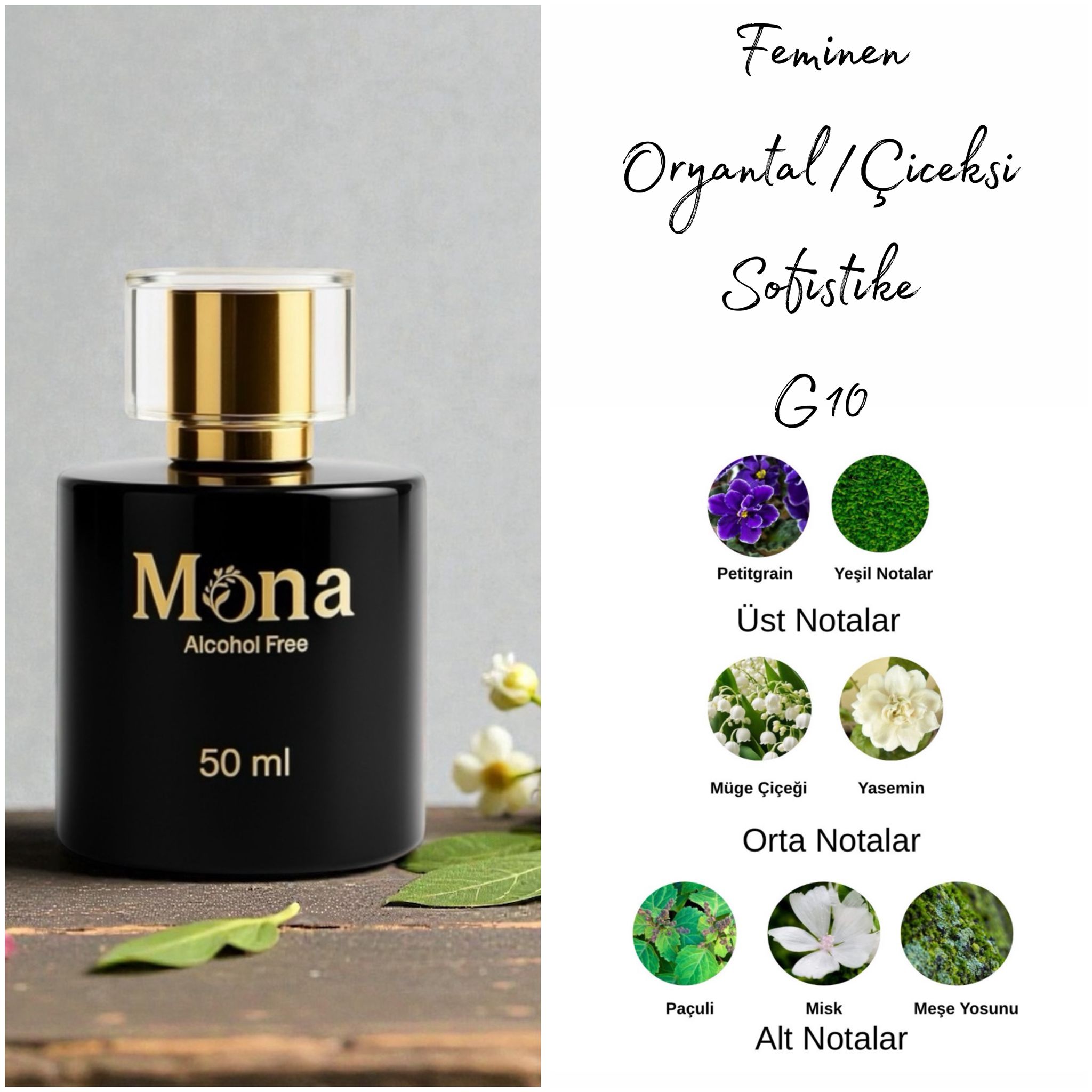 MONA G10; sakin, zarif ve yumuşak feminenliği temsil eden romantik çiçeksi–pudramsı dokusuyla huzurlu ve zarif bir etki bırakır. Açılışta bergamot ve armudun hafif tatlı ferahlığı birleşerek nazik ve zarif bir başlangıç sunar.